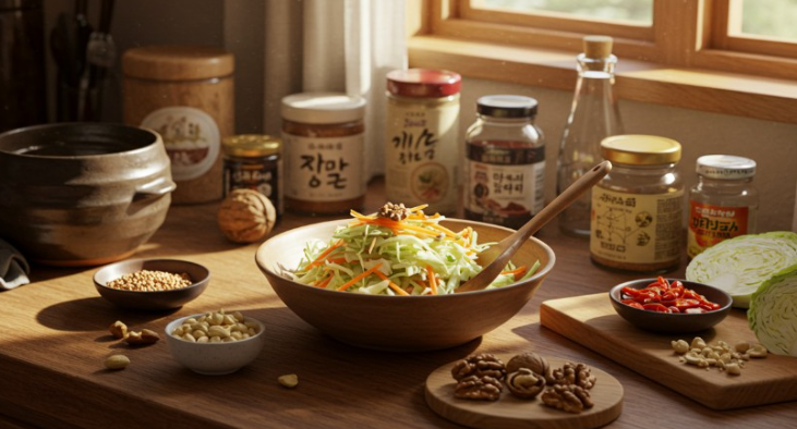 코울슬로 스타일은 채소의 아삭함과 견과류의 고소함이 조화를 이루는 기본 레시피입니다.